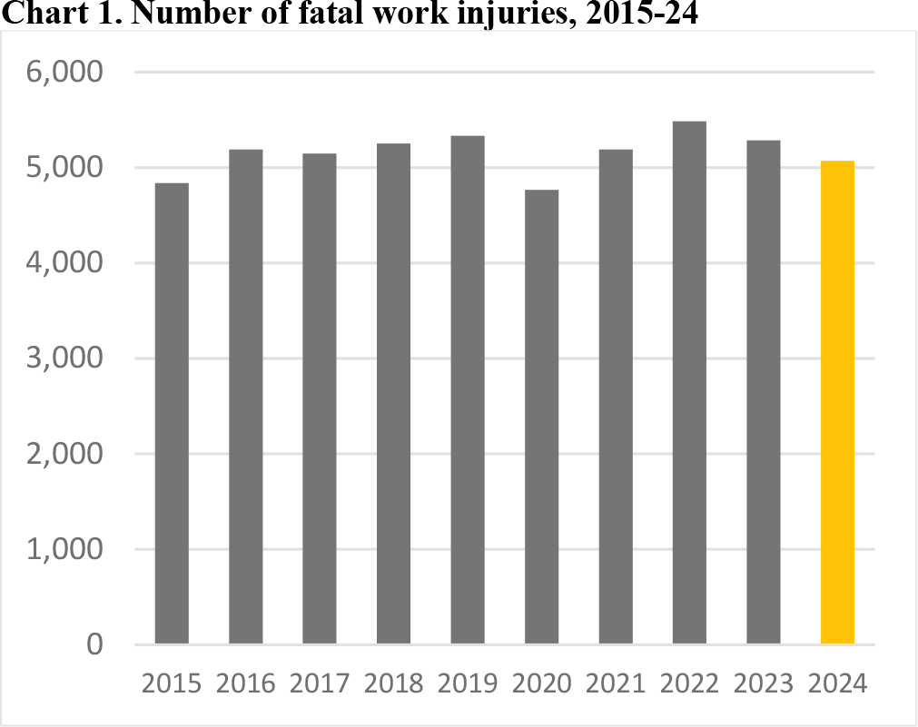 There were 5,070 fatal work injuries recorded in the United States in 2024, down 4.0 percent from 5,283 in 2023, the U.S. Bureau of Labor Statistics reported today. (See chart 1 and table 1.) The fatal work injury rate was 3.3 fatalities per 100,000 full-time equivalent (FTE) workers in 2024, a decrease from a rate of 3.5 in 2023. (See chart 2.) These data are from the Census of Fatal Occupational Injuries (CFOI).