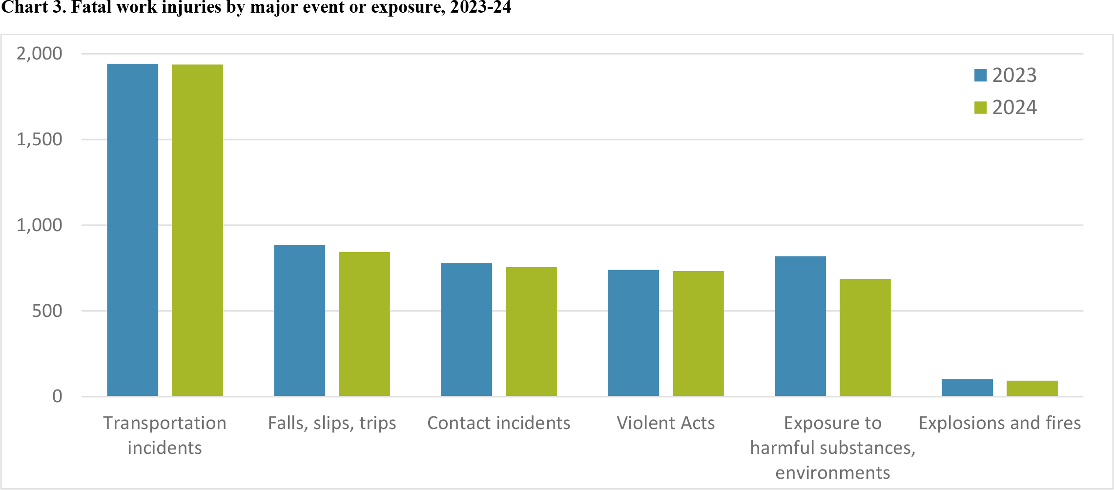 - Transportation incidents continue to be the most frequent type of fatal event, accounting for 38.2 percent of all occupational fatalities in 2024. The total number of fatal transportation incidents decreased to 1,937 in 2024 from 1,942 in 2023.